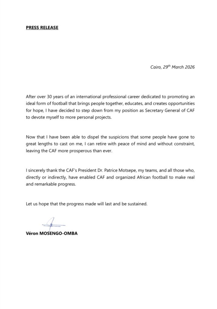 “After over 30 years of an international professional career dedicated to promoting an ideal form of football that brings people together, educates, and creates opportunities for hope, I have decided to step down from my position as Secretary General of CAF to devote myself to more personal projects.