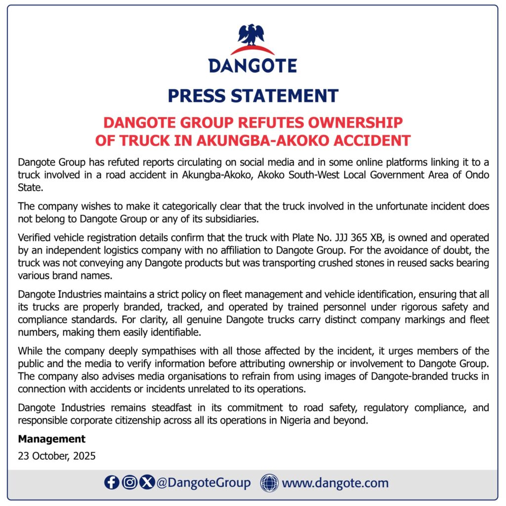 The statement titled Dangote Group refutes ownership of truck in Akungba-Akoko accident, read: