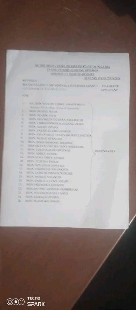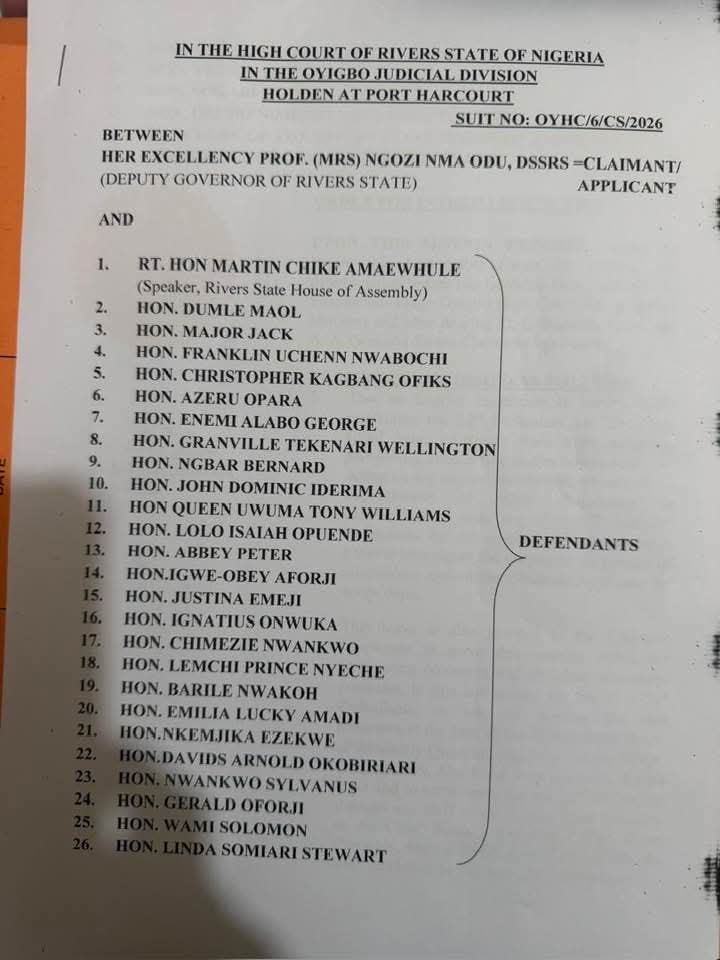 The presiding judge, Justice F.A. Fiberesima, in a ruling on a motion ex parte in two separate suits filed by Governor Siminalayi Fubara and the Deputy Governor, Prof. Ngozi Odu, also granted leave to the claimants/applicants to serve the interim order and the originating processes in Suit No. OYHC/7CS/2026 and Suit No. OYHC/6/CS/2026, as well as all subsequent processes meant for the first to 31st defendants at the gate of the Rivers State Assembly quarters.