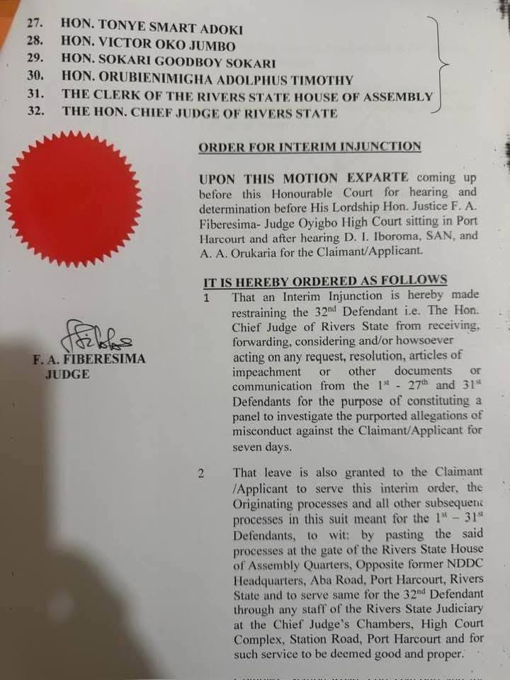 The court also restrained the Chief Judge of Rivers State, Justice Simeon Amadi, from receiving, forwarding, considering or in any way acting on any request, resolution, articles of impeachment or other document from the first to the 27th defendants for the purpose of constituting a panel to investigate the alleged misconduct against the state governor and his deputy for seven days.