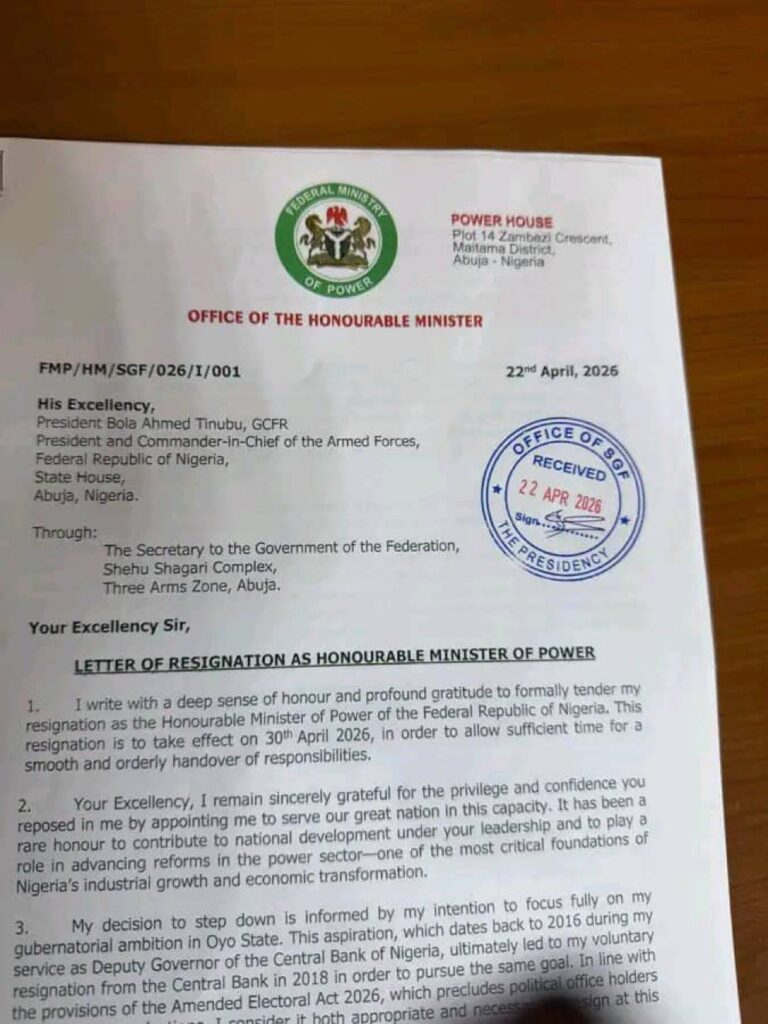 Adelabu announced his resignation in a letter dated April 22, 2026, addressed to President Bola Tinubu.