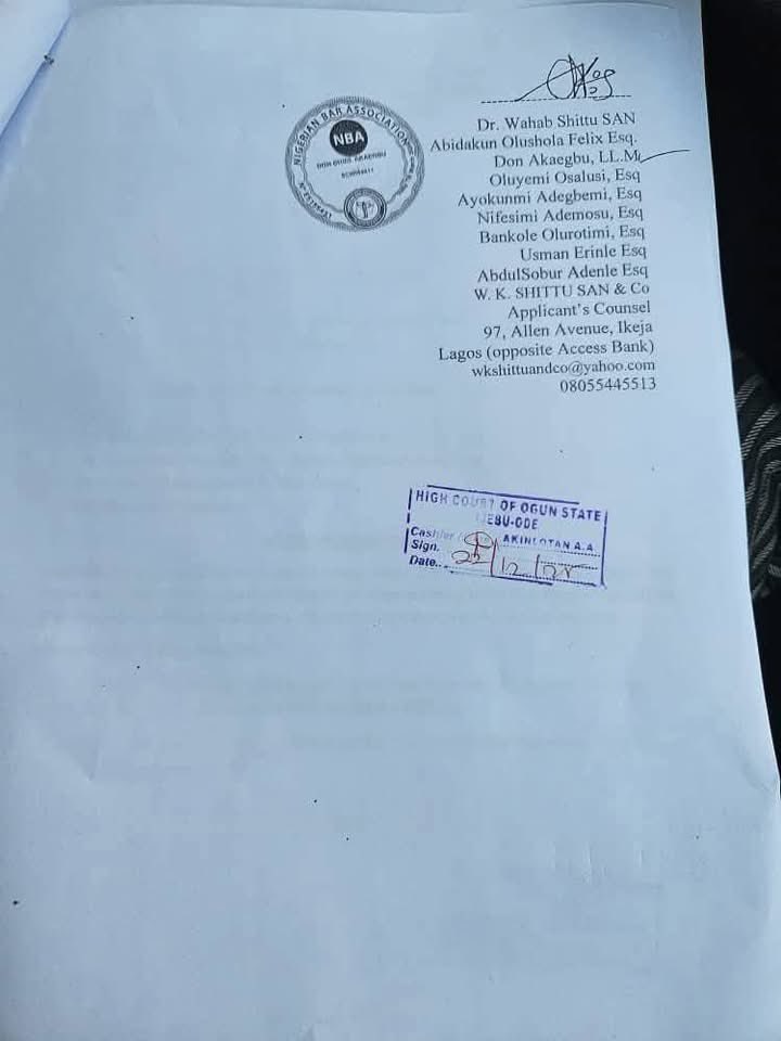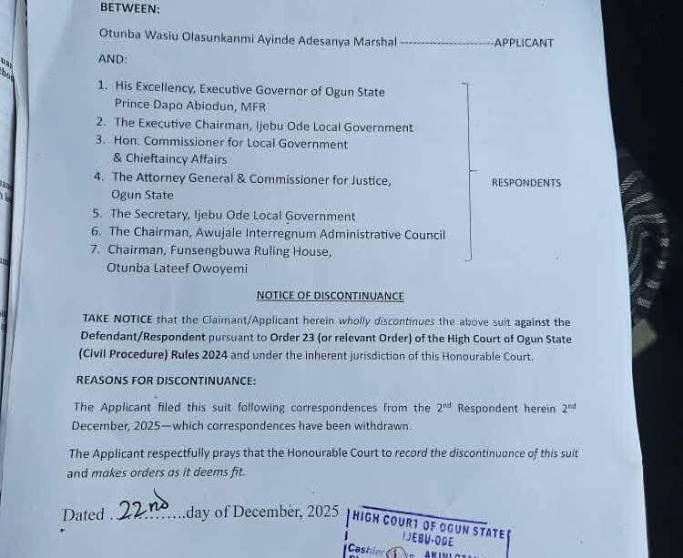 The Fuji musician filed a Notice of Discontinuance before the Court dated December 22, 2025, following correspondence from the Chairman of the Ijebu-Ode Local Government Area.