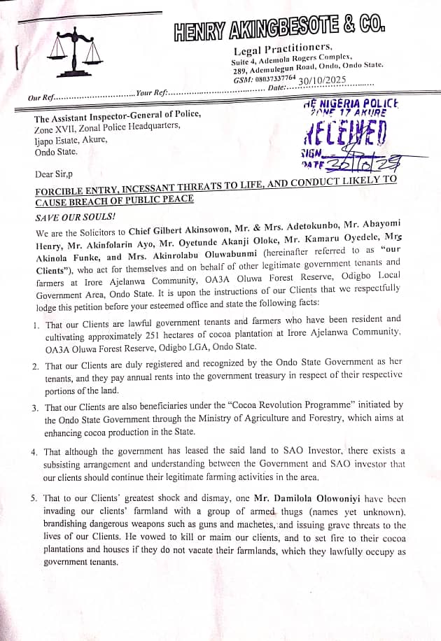 The petition, signed by their solicitor, Henry Akingbesote, and dated Oct. 30, alleged that one Damilola Olowoniyi invaded the community’s cocoa plantations with a group of armed men, issuing threats and asking the farmers to vacate the land.