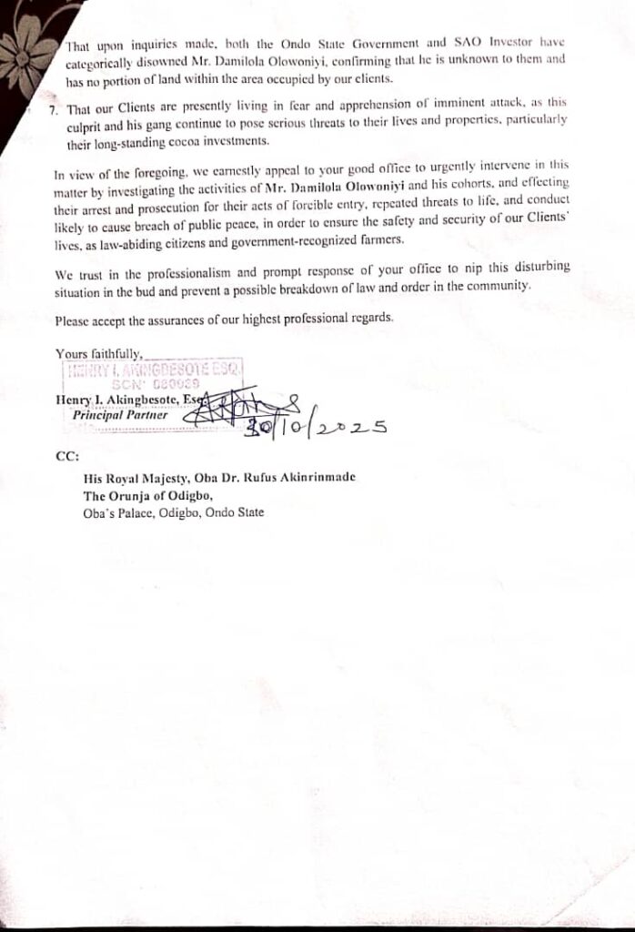 The solicitor said inquiries revealed that both the Ondo State Government and SAO Investor had denied knowledge of Olowoniyi’s action and confirmed that he had no land rights within the area occupied by the farmers.