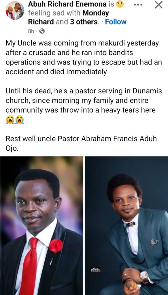 “My Uncle was coming from Makurdi yesterday after a crusade when he ran into bandits. He tried to escape but had an accident and died immediately,” Enemona wrote.