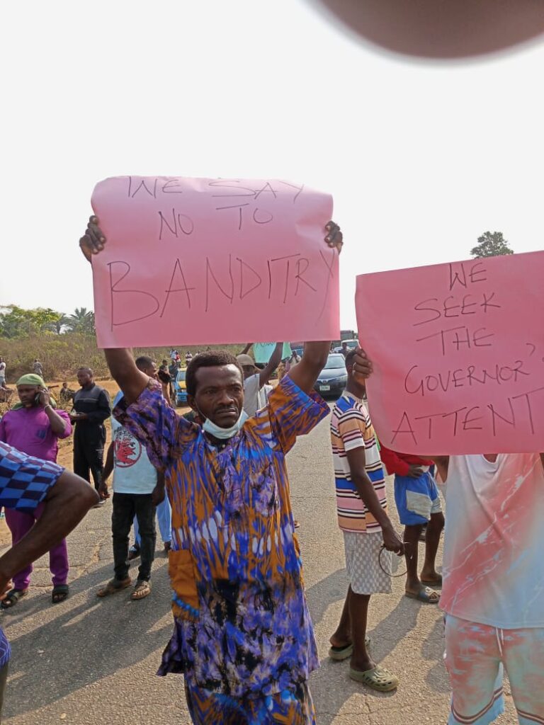 Some of the placards read: “We Seek Governor’s Intervention,”; “We Say No To Banditry,” among others.