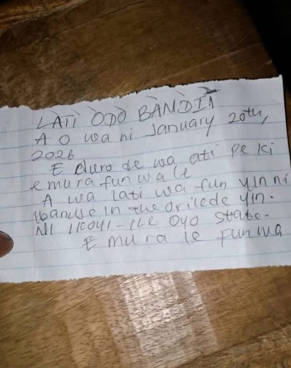 The letter written in Yoruba read: “Lati Odo Bandit, A o wa ni January 20th, 2026. E duro de wa ati pe ki e mu ra fun wa le. A wa lati wa fun yin ni ibanuje ni orilede yin. Ni Ikoyi-Ile Ile Oyo State. E mu ra le fun wa.”